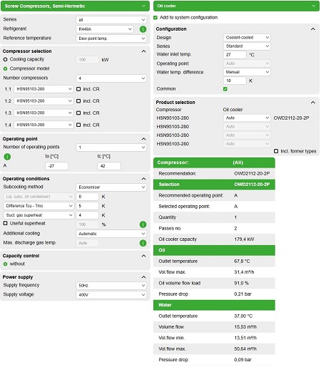 OWD serisi, BITZER Yazılımında; BITZER açık tahrikli OS ve yarı hermetik HS vidalı kompresörlerle birleştirilebilir. BITZER Yazılımı kullanıcıların istedikleri kompresörü manuel olarak seçmelerine olanak tanır veya kapasite, çalışma koşulları ve özel gereksinimlere göre uygun bir kompresör önerir. Kompresör belirtildikten sonra aksesuarlar seçilebilir. HS veya OS kompresör ise, BITZER Yazılımı gerekli soğutma kapasitesini hesaplar ve gerekirse uygun bir yağ soğutucusu önerir. Alternatif olarak, kullanıcı "Ek soğutma" bölümünde "Harici yağ soğutma" seçeneğini manuel olarak seçebilir. Tüm ilgili teknik veriler basit bir biçimde sunulduğunda, kullanıcı gereksinimlerine göre ayarlamalar yapabilir ve seçimi inceleyebilir. Sıcaklıklar ayrıca ikincil sayfada özelleştirilebilir ve böylece bileşenlerin optimum koordinasyonu garanti edilir. Bu otomatik süreç yapılandırmayı basitleştirir ve verimli, güvenilir bir sistem tasarımı sağlar.