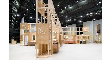 burgbad, ISH'de sergi standı inşası için sürdürülebilir bir tasarımın ne kadar çekici ve işlevsel olabileceğini etkileyici bir şekilde gösteriyor: ISH 2023 için stand konseptinin yeni bir versiyonu olarak, modüler oda sistemi kanıtlanabilir şekilde geri dönüştürülebiliyor. Yüzeyde yüksek bir ahşap raf ve onu örten şeffaf bir perde ile sunum için çeşitli görsel eksenler ve seviyeler yaratılıyor. Sürdürülebilir malzeme konsepti en ince ayrıntısına kadar düşünüldü: Burgbad logoları kontur kesilmiş kağıt petekler şeklinde gerçekleştirildi.