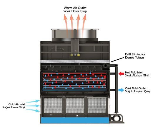 Soğutulmak istenen akışkan kapalı çevrim soğutma kulesinin içerisinde yer alan eşanjörlerin üst kolektöründen pompalar vasıtasıyla girer ve eşanjör boruları içerisinde dolaşır. Su dağıtım sisteminden eşanjörlerin üstüne su püskürtülmesi gerçekleşir. Bu sayede boruların içinde dolaşan soğutulmak istenen akışkan ısısı suya aktarılır. Aynı zamanda soğutma kulesinin havuz kısmının üstünde yer alan panjurlardan taze hava fanlar yardımı ile içeri çekilir. Su akışı yönüne karşı olacak şekilde, hava akışı yukarı yönlü gerçekleşir. Panjurlardan soğutma kulesine çekilen hava eşanjör boyunca yukarı hareket ederek kulenin en üst noktasından fan bacaları vasıtasıyle kuleden atmosfere atılır. Serpantinlerin üstüne püskürtülen suyun küçük bir kısmı bu süreçte buharlaşır. Bu sayede sistemden atılmak istenen ısı atılmış olur. Soğutulan akışkan eşanjörün alt noktasında yer alan kolektörden sisteme tekrar gönderilir.